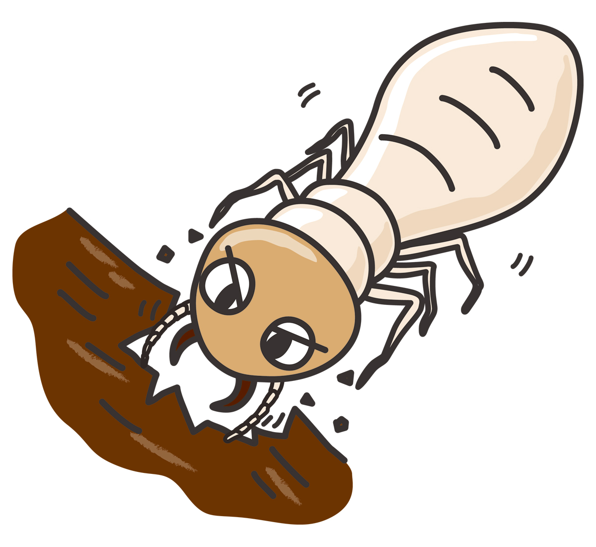 - 湿った木材はシロアリの大好物です。ひび割れから入った水が壁内の柱を濡らし、そこにシロアリが住み着くと、耐震性が著しく低下します。